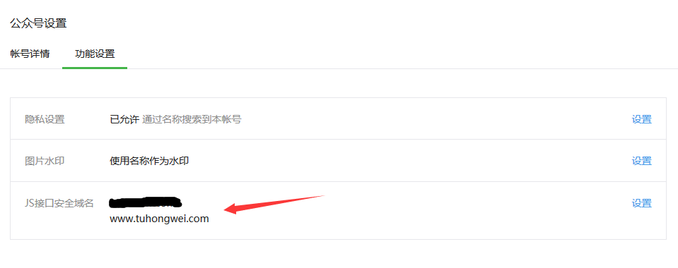 1、登录微信公众平台 https://mp.weixin.qq.com ,点左侧菜单“设置”中的“微信公众号设置”-“功能设置”,点“JS接口安全域名”后面的“设置”,输入要接入的网站域名。